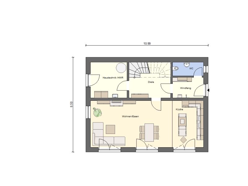Wohnen auf zwei Vollgeschossen, kein Keller Pultdach mit Stehfalzblech, Dachneigung 8° Außenmaße: 10,99 + 8,50 m Wohnfläche: 133 m²