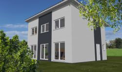 Wohnen auf zwei Vollgeschossen, kein Keller Pultdach mit Stehfalzblech, Dachneigung 8° Außenmaße: 10,99 + 8,50 m Wohnfläche: 133 m²